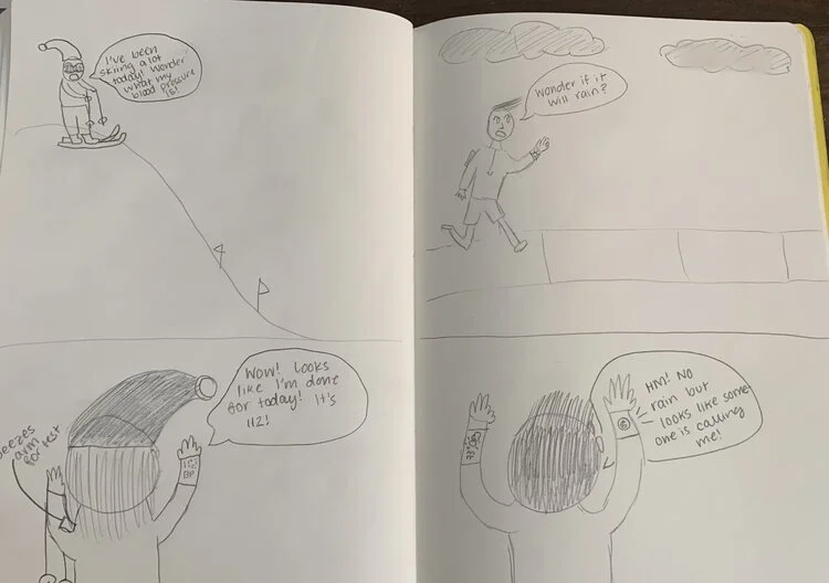For our video prototype we created physical prototypes to demonstrate how the product would work. We used simple office supplies to represent the information that would be shown on screens placed on the sleeves of the jacket. Kendra used a foam core to represent a display screen for this iteration of the prototype. The foam core, moreover, is used here to display the information that will pop up on screen when the user initiates an action, but the final product will be a flat surface on the jacket. For example, the sleeve around a wrist that shows vitals and outside temperature looks more like a watch as a foam core prototype, but will not look like a watch in a more high fidelity model further down the line. The same is true for the foam core representation of a phone screen that is presented on the opposing sleeve. In a more high fidelity model we imagine the wrist information to be presented with LED lights.